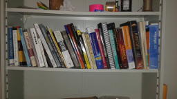 <p>Your bookshelf has six shelves. The second shelf contains all 35 books. Most are related to either nature, or science and engineering. You haven't finished any of these books -- they're all new books you've acquired while in mental care.</p>